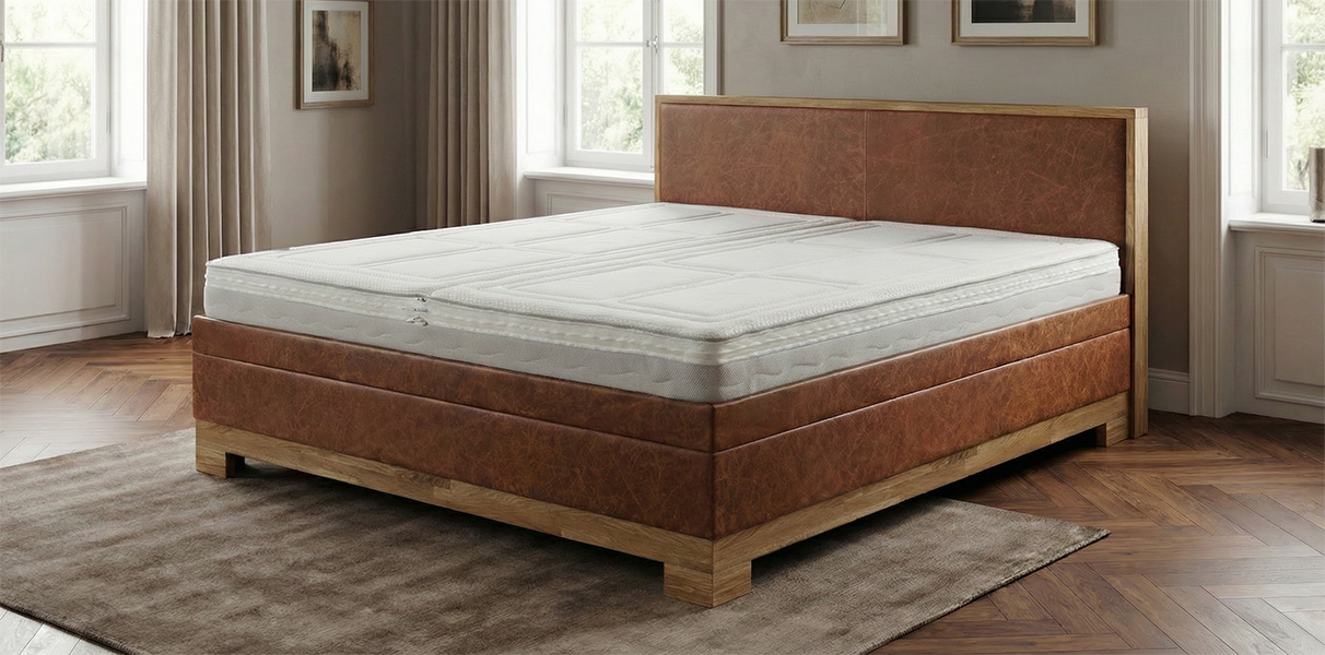 Bezogen ist das komplette Wasserbett in Boxspring-Optik mit hochwertig gegerbtem Echtleder in der Farbe Ihrer Wahl – zur Auswahl stehen unsere bewährte Zenith-Kollektion sowie die besonders edle Tuscania-Kollektion. In Kombination mit den Massivholzelementen aus Buche oder Eiche entsteht ein zeitlos elegantes Gesamtbild. Kleiner Tipp: Ein Kontrast zwischen Leder und Massivholz – etwa dunkles Leder mit heller Eiche – wirkt optisch besonders gut!