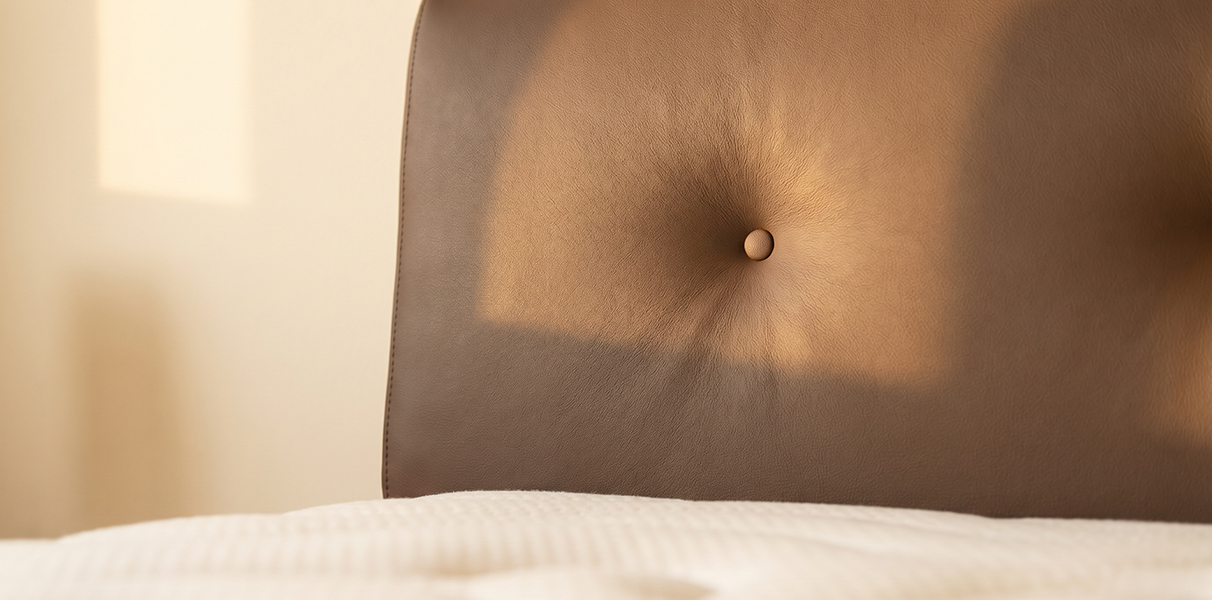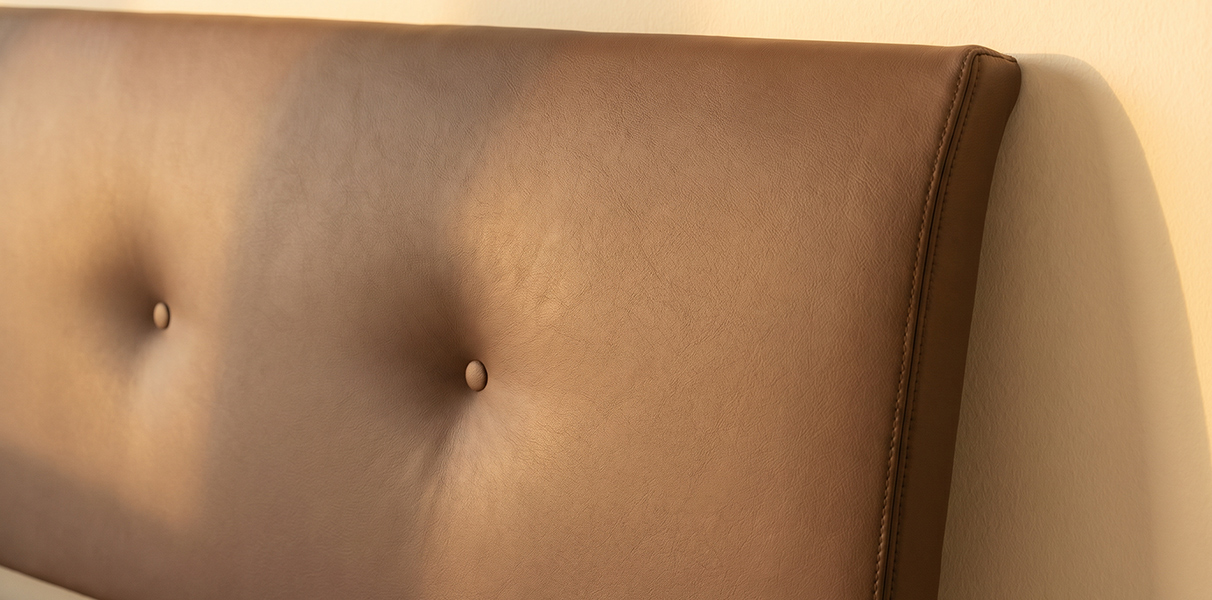 Das Polster-Kopfteil RIANNA setzt auf ein Design, das Behaglichkeit sichtbar macht: Die weich modellierte, leicht überfallende Oberkante wirkt wie ein über den Rahmen geworfenes Kissen und verleiht dem Kopfteil seinen unverwechselbaren Loungecharakter. Vier mittig in einer Reihe gesetzte Zierknöpfe bilden das ruhige, klassische Detail, das RIANNA seinen dezenten Chesterfield-Touch gibt – ohne opulent oder überladen zu wirken.