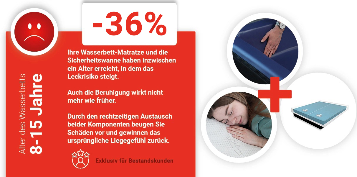 Mit den Jahren lässt der Komfort Ihres Wasserbettes nach. Die Beruhigungsstufe Ihrer Wassermatratze ist eventuell nicht mehr wie früher, Ihr Bezug spannt oder zeigt Abnutzungserscheinungen, und das Vinyl von Matratzen und Sicherheitswanne altert. Dieses Alter erhöht das Risiko für ein Wasser-Leck signifikant. Mit diesem umfassenden Set frischen Sie Ihr Wasserbett auf, gewinnen das ursprüngliche Liegegefühl zurück und beugen gleichzeitig Schäden vor.