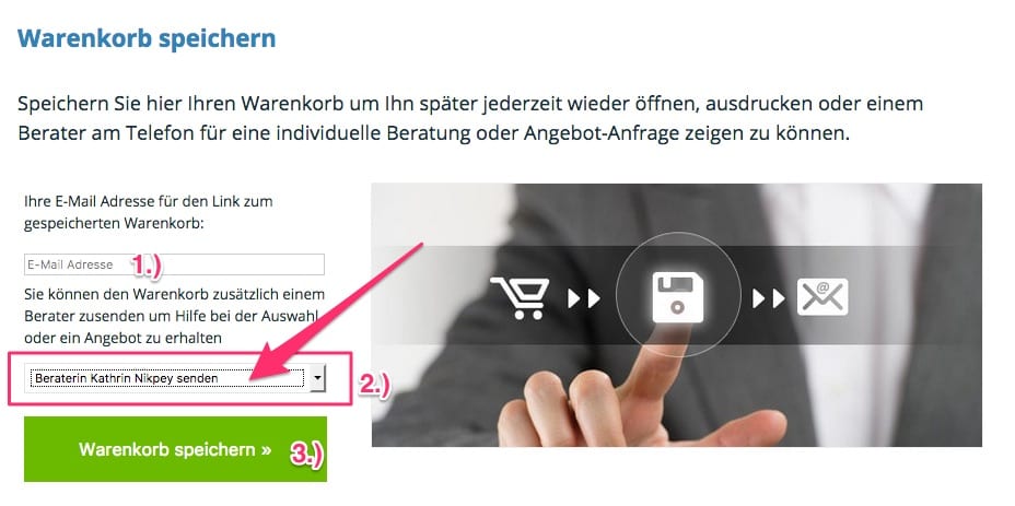 Senden Sie Ihren Warenkorb einem Berater zu und sprechen Sie mit Ihm/Ihr über einen möglichen Kauf ohne Webshop.
